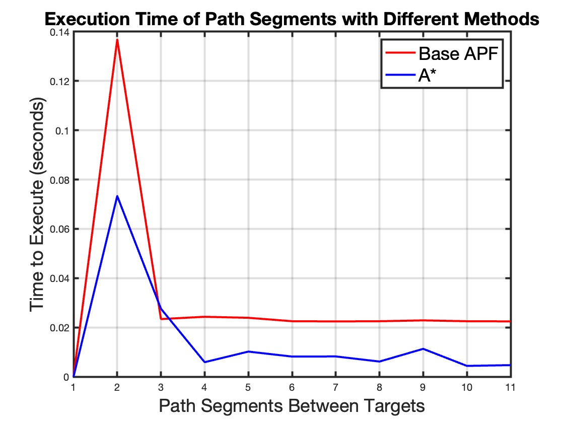 Execution time comparison: Base APF (red) vs A* algorithm (blue) across path segments