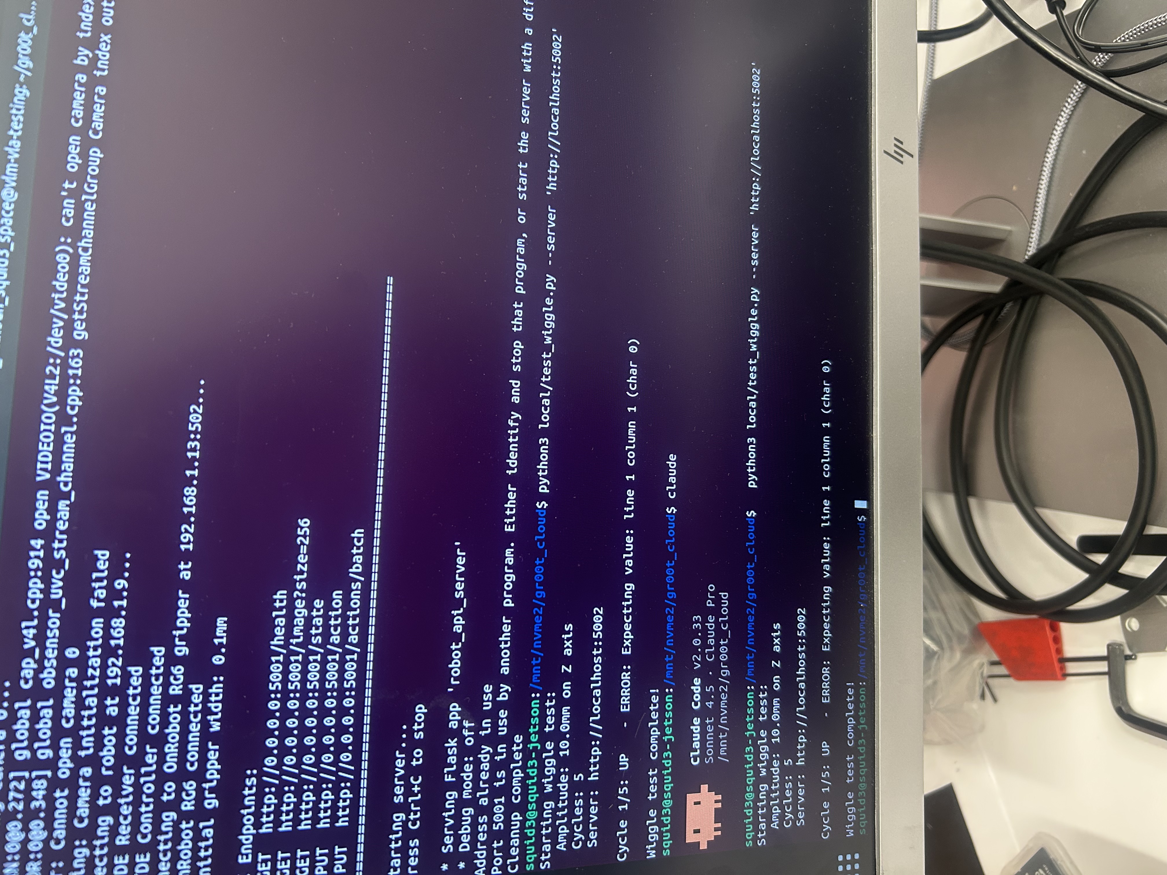 Terminal output showing NVIDIA GROOT model initialization, robot connection, and server startup sequence